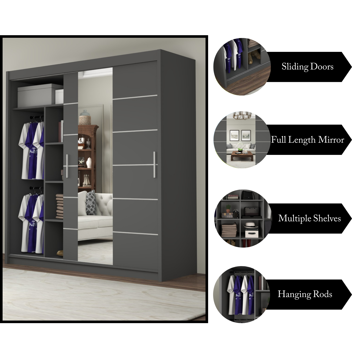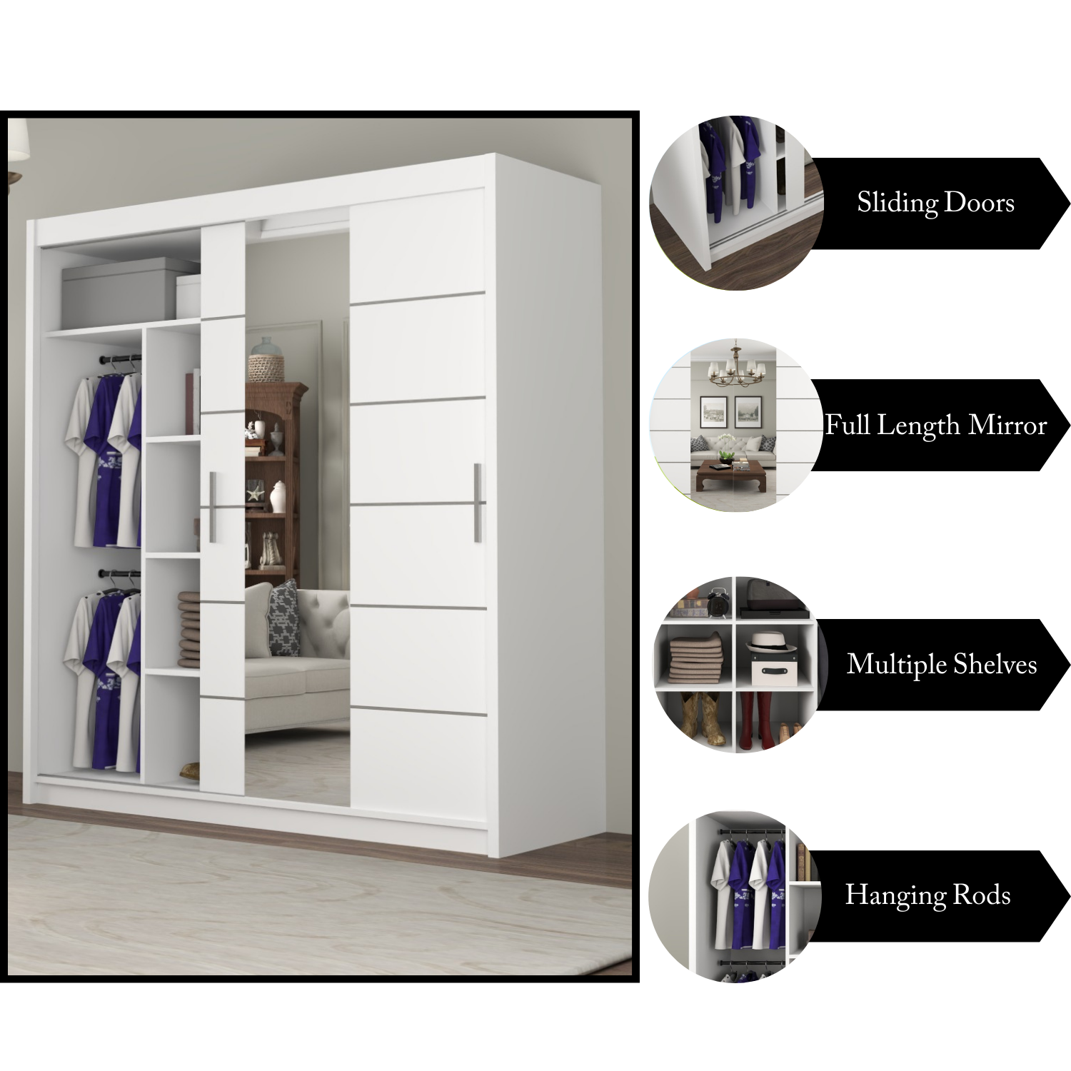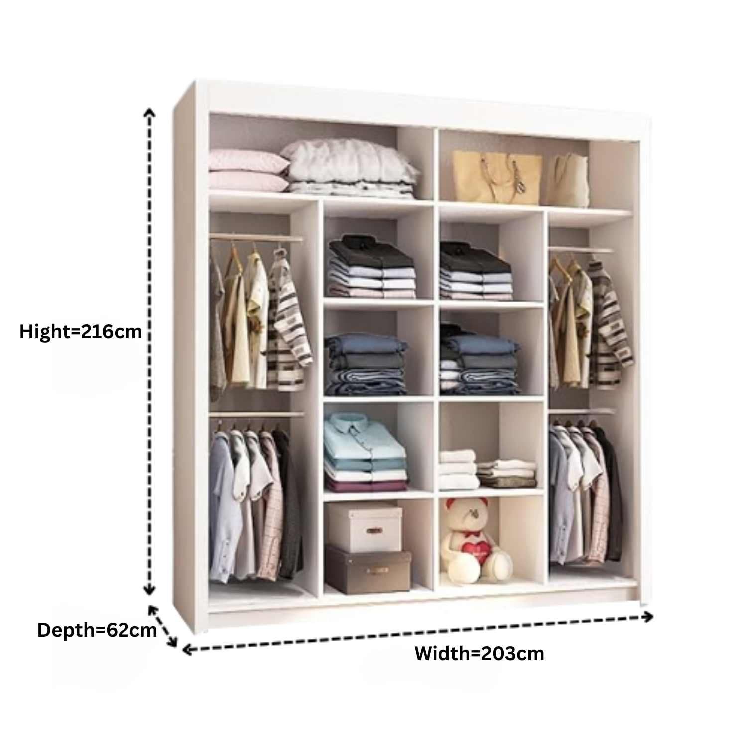 This wardrobe also benefits from the high-quality sliding mechanism and you would barely hear any noise with the smooth gliding motion of the doors. It is crafted from 16 mm laminated particle board to give you beauty, stability, and durability all in one! Add extra hanging rails and you can configure this wardrobe in different ways (refer to images).